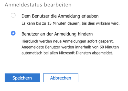 Nach Anmeldung an Office 365 kann die Administrationsoberfläche mit einem Klick auf die Kachel mit den 9 Punkten unter Administrator in den Apps gestartet werden. Unter Benutzer bearbeiten kann der betroffene Benutzer markiert und dessen Anmeldung dann unter Anmeldestatus verhindert werden.