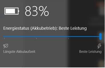 Um das zu erreichen, klickt auf das Akkusymbol in der Taskleiste. Dort findet ihr einen Regler, an dessen linkem Ende die längste Akkulaufzeit steht. Zieht diesen ganz nach rechts, um die Beste Leistung einzustellen. Der Akkuverbrauch nimmt zu, das Gerät ist aber spürbar schneller.