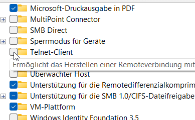 - Scrollt nach unten bis zum Eintrag Telnet-Client und setzt den Haken.