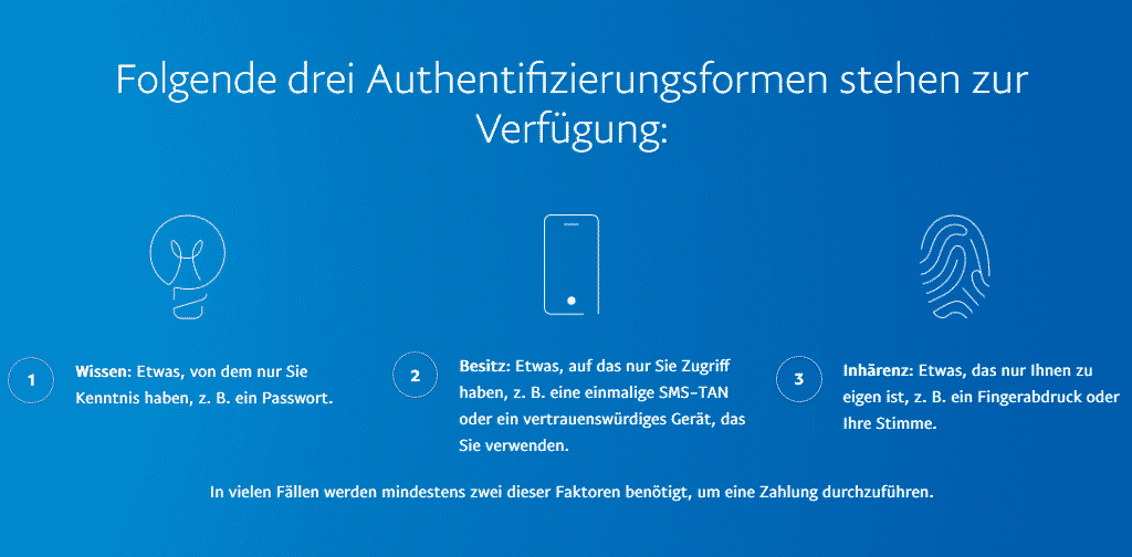 Die zweite Zahlungsdiensterichtlinie (PSD2) sieht vor, dass bei Zahlungsdienstleistern – zu denen PayPal gehört – weitere Sicherheitsmechanismen greifen müssen. Damit wird für bestimmte Transaktionen zwingend vorgeschrieben, dass neben dem ersten Faktor Passwort noch mindestens ein weiterer abgefragt werden muss. Die Faktoren teilen sich in drei Klassen:
