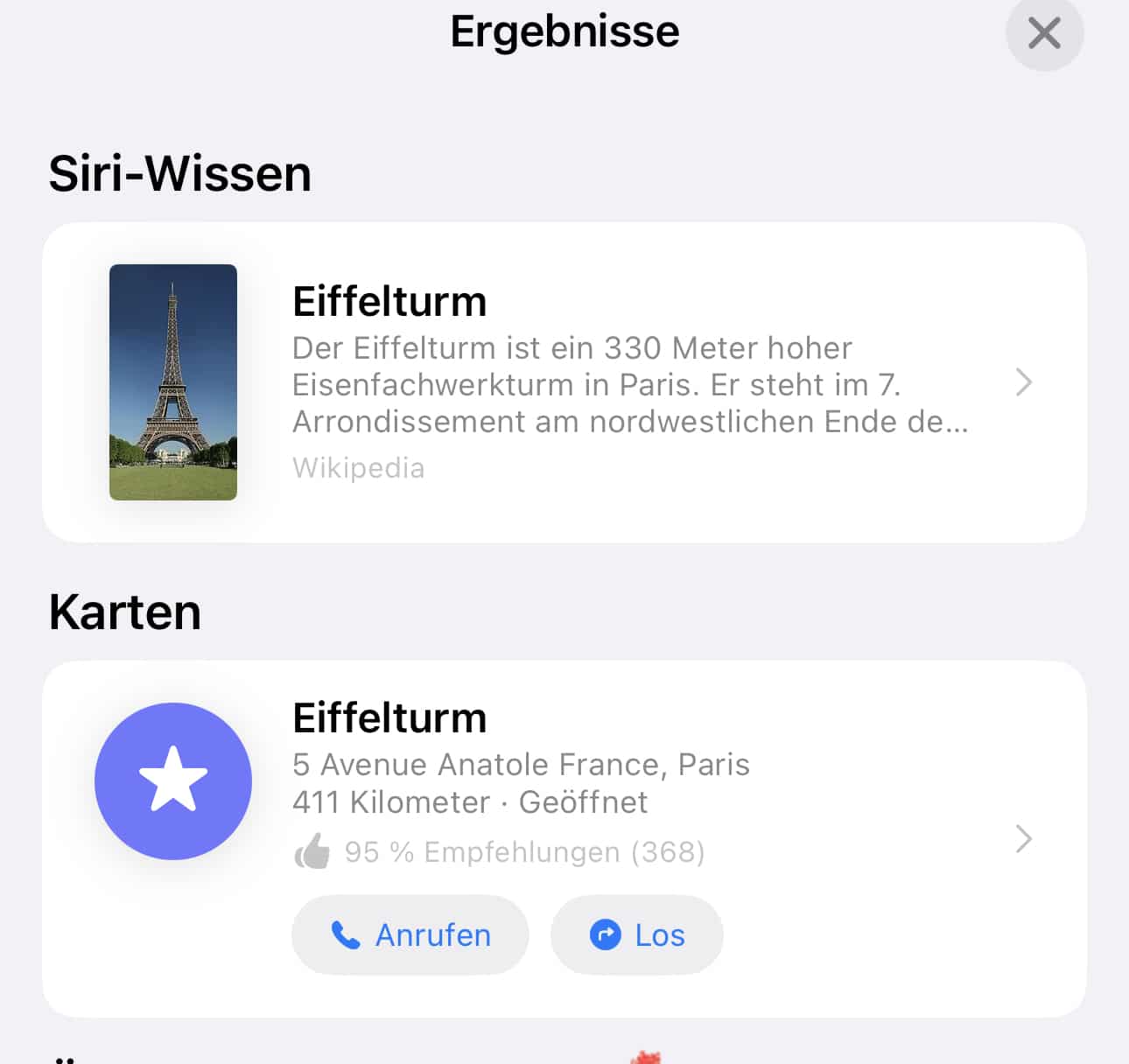 - iOS zeigt euch die Zusatzinfos an, nach Kategorien sortiert. Über die Karten könnt Ihr euch die Umgegend anzeigen lassen, Siri-Wissen bietet Zusatzinformationen, Fotos andere Bilder vom selben Objekt.