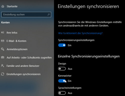 Unter Einstellungen > Konten > Windows-Sicherung (bei Windows 11) aktivieren Sie die Synchronisation. Bei Windows 10 findet ihr die Option noch unter Einstellungen synchronisieren. Der Hauptschalter muss eingeschaltet sein, dann könnt ihr bei den einzelnen Bereichen festlegen, welche Elemente synchronisiert werden sollen.
