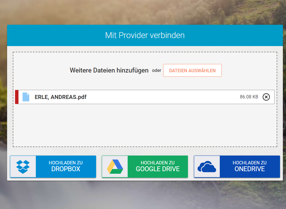 Für die Nutzung von Whisply benötigt ihr kein Konto beim Dienst selbst, wohl aber eines bei DropBox, OneDrive oder Google Drive, denn dort wird die verschlüsselte Datei abgelegt. Ziehen Sie die Datei(en) in das Whisply-Fenster, dann klicken Sie auf Hochladen zu… und wählen Sie den Cloudservice Ihrer Wahl aus.