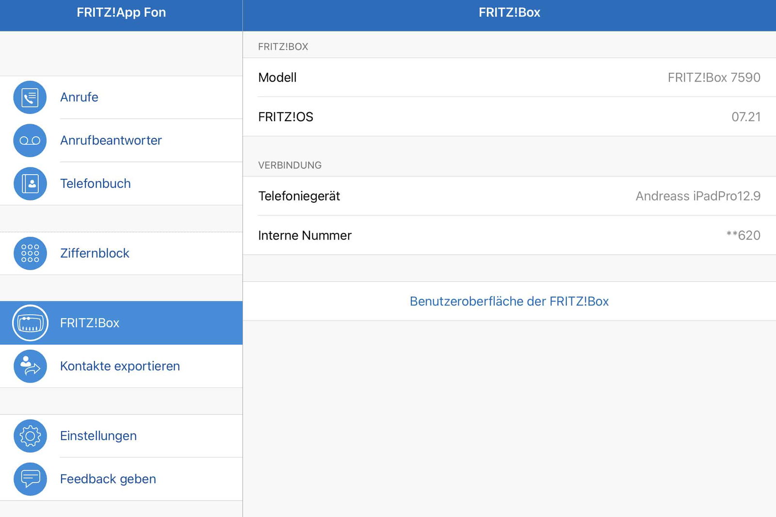 Das integrierte Telefonbuch greift direkt auf die in der Fritz!Box gespeicherten Kontakte zu. Von hier startet ihr mit einem Fingertip Anrufe oder exportiert die Kontakte via Kontakte exportieren direkt ins Smartphone-Adressbuch. Der klassische Ziffernblock steht natürlich auch zur Verfügung – perfekt für spontane Anrufe, wenn ihr nur die Rufnummer zur Hand habt.