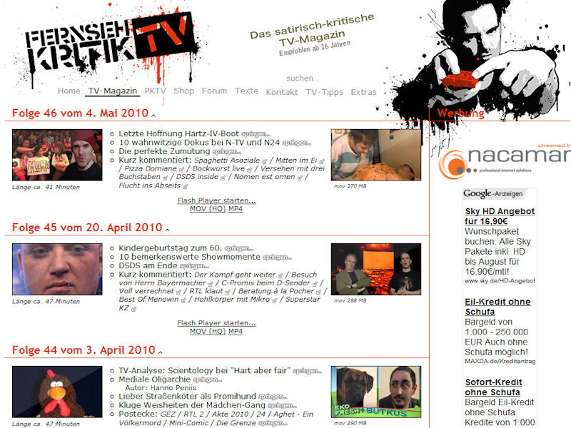 So tief wie er sticht sonst kaum jemand in die Wunden der deutschen Fernsehmacher. Aber sein satirisch-kritisches Web-TV-Magazin «Fernsehkritik-TV» ist mehr als simple Mediendresche. Im Gegenteil: Holger Kreymeyer berichtet ausgesprochen humorvoll, kenntnisreich und vor allem ausgiebig über Wischi-Waschi-Sendungen und Seichtproduktionen mitsamt ihren Abgründen und Banalitäten. So leuchtet er hinter die Kulissen von Deutschlands Superstar-Suchern, fühlt Soap-Serien auf den Zahn und lästert über die GEZ. Eine eigene Rubrik ist besonders peinlichen Pantoffelkino-Pannen gewidmet, zu finden unter «Schlechte Filme TV».