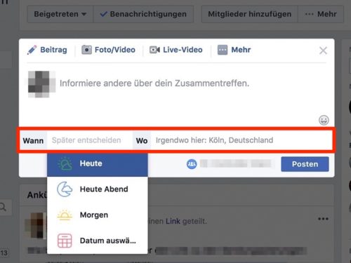 Anstatt aufwendig mehrere Termine in einer Umfrage anzubieten und das Ergebnis dann als Treffen in einer Gruppe zu posten, lassen sich Events jetzt direkt erstellen und verwalten. Die Funktion Veranstaltung erstellen findet sich in der Leiste unter dem Beitragsfenster in einer Gruppe oder über das Plus-Symbol im Hauptmenü.