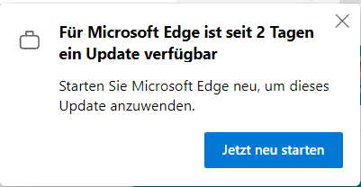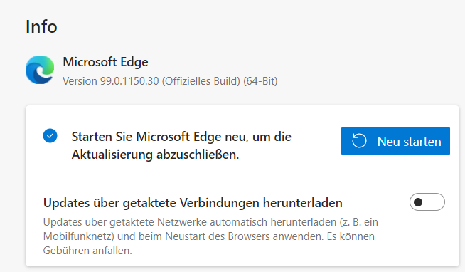 Im drei-Punkte-Menü von Edge unter Einstellungen > Infos zu Microsoft Edge > Info findet Ihr den aktuellen Stand der Version von Edge. Edge sucht automatisch nach Updates, wenn Ihr diesen Bereich öffnet. Wird ein Update gefunden, dann zeigt Edge es an und es kann über einen Klick auf Jetzt neu starten installiert werden.