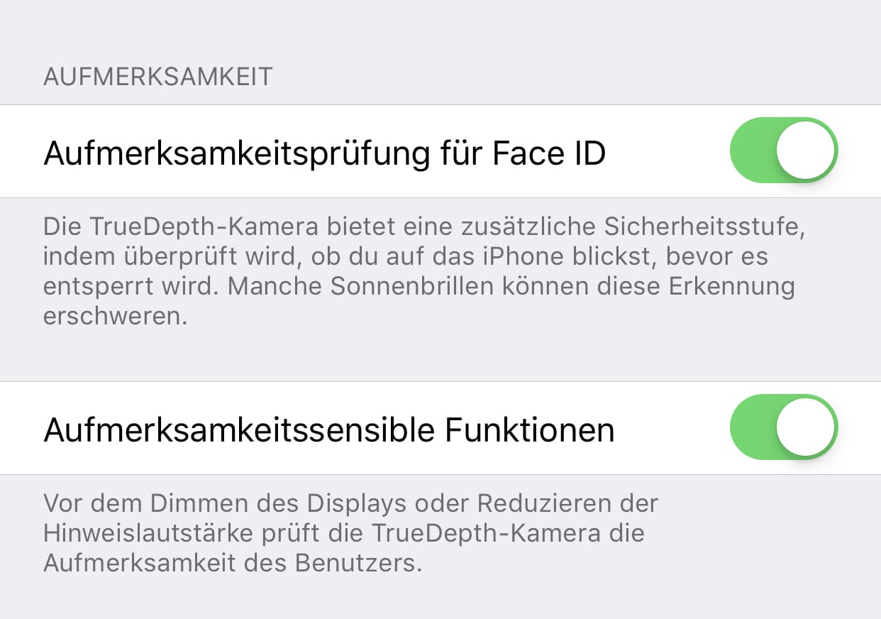 Hilfreich auch: Die Kamera, die für Face ID verwendet wird, können Sie auch verwenden, um das Ausgehen des Displays zu verhindern. Aktivieren Sie die Aufmerksamkeitsprüfung für Face ID. Auch wenn Sie das Gerät nicht bedienen, aber es anschauen, bleibt es dann an.