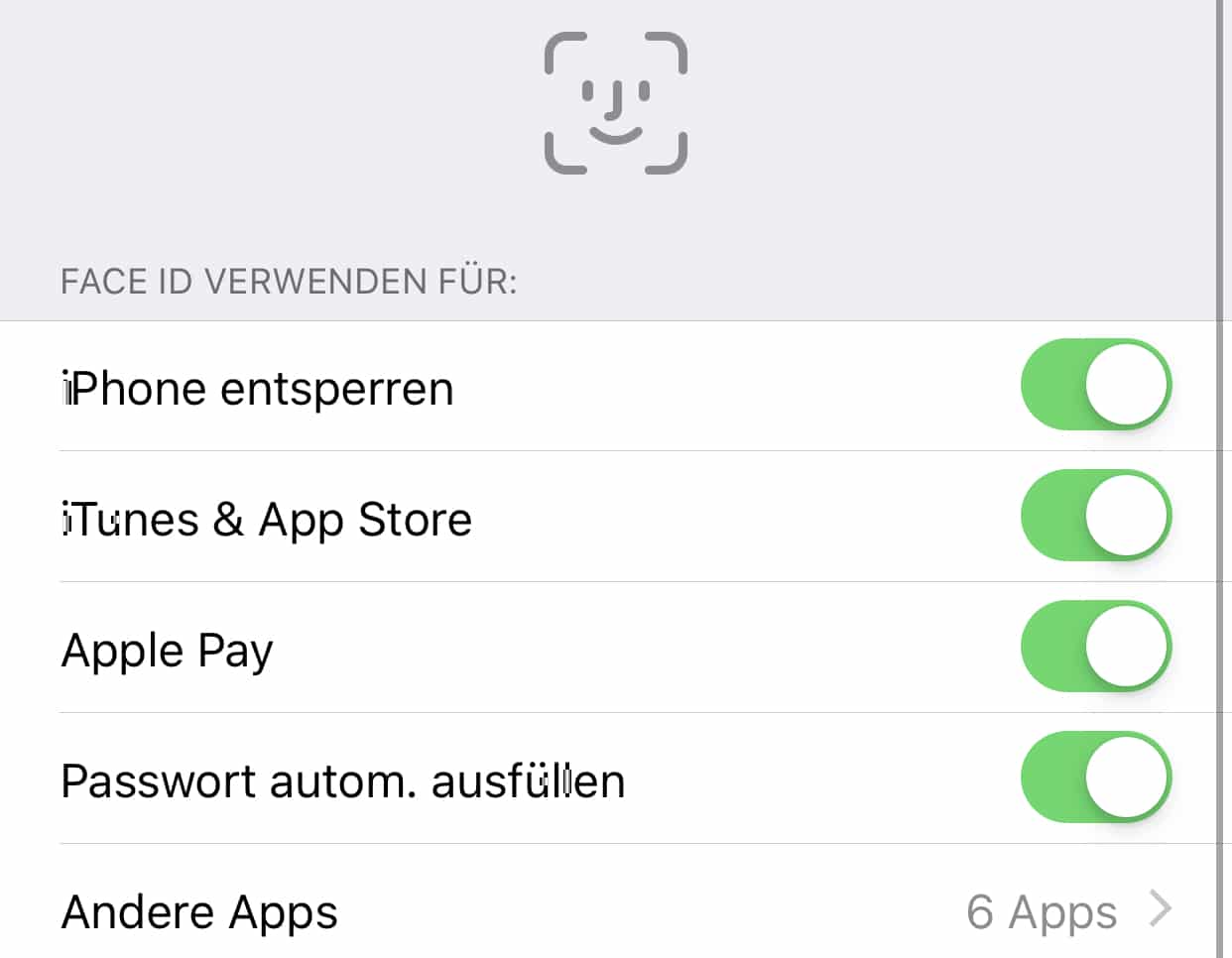 Die iOS-Einstellungen erlauben Ihnen eine sehr feine Steuerung der Verwendung von Face ID. Unter Face ID verwenden für können Sie einschalten, für welche System-Funktionen und für welche Apps Face ID genutzt werden soll.
