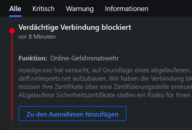 Gute Sicherheitssoftware überwacht auch diese Bedrohungen. Bitdefender beispielsweise meldet in einem solchen Fall eine „Verdächtige Verbindung“. Das ist erst einmal gut, denn dann ist diese blockiert und es konnte kein Schaden angerichtet werden. Die Ursache ist damit aber weiterhin nicht geklärt, geschweige denn abgestellt.
