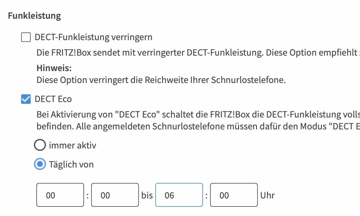 Bei dem DECT-Sender der Fritz!Box erreichen Sie dies, indem Sie im Hauptmenü auf Telefonie > DECT und aktivieren dann DECT Eco. Legen Sie dann den Zeitraum fest, in dem die Funktion aktiv sein soll – beispielsweise in den Nachtstunden. Sobald alle Handgeräte im Standby (und damit länger nicht genutzt sind), schaltet die Fritz!Box die DECT-Funktion komplett aus. Sobald ein Gerät aufgeweckt wird oder ein Ruf eingeht, wird sie natürlich automatisch wieder eingeschaltet!