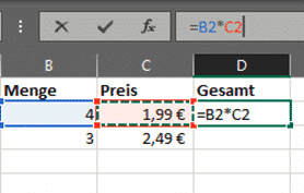 Wenn ihr als Beispiel in der Zelle B2 die Menge eines Produktes stehen habt und in der Zelle C2 den Einzelpreis, dann ist die Formel für den Gesamtpreis =B2*C2.