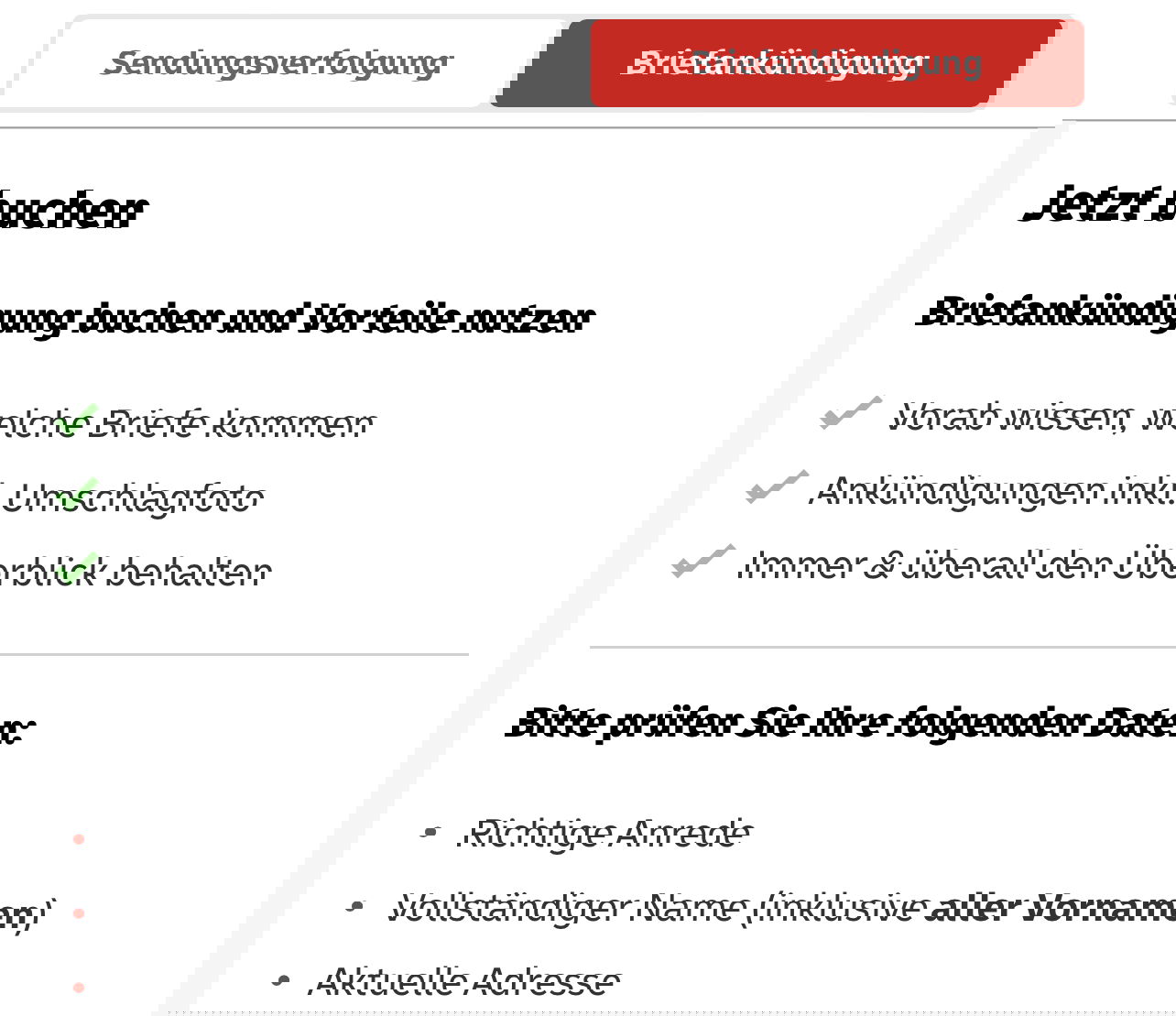 Die Briefpost folgt immer noch dem klassischen Verteilungsmodell: Der Brief wird frankiert, in einen Briefkasten oder eine Filiale eingeliefert, dort abgeholt, über Verteilzentren und Briefträger an euch zugestellt. Die Laufzeiten variieren hier zwischen einem und fünf Tagen, manchmal sind sie auch länger. Da kann es schon helfen, im Vorfeld eine Information über eine kommende Sendung zu bekommen.