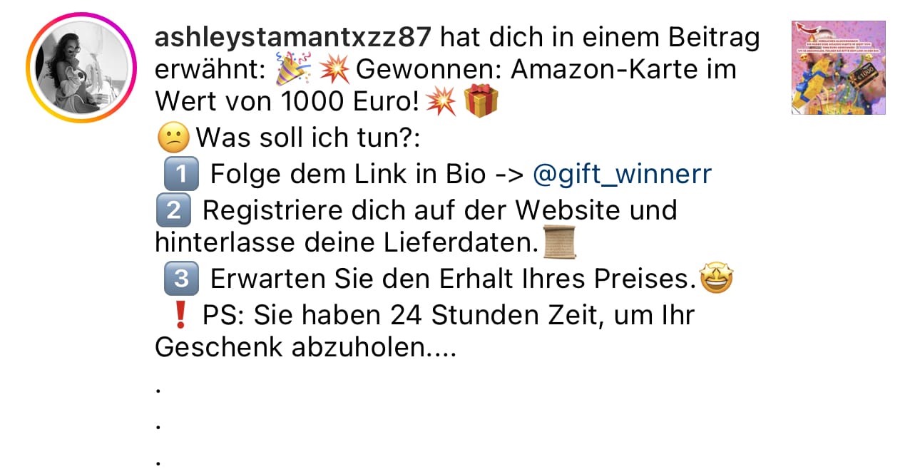 Eine zweite, immer häufiger vorkommende Variante des SCAMs läuft über soziale Netzwerke. Ihr habt gerade auf Instagram oder TikTok ein Bild oder Video hochgeladen und bekommt kurze Zeit später eine Nachricht, dass der Content so toll ist, dass ihr Geld dafür bekommen sollt. Oder eine Amazon-Geschenkkarte. Ihr müsst nur auf einen Link klicken und euch anmelden.