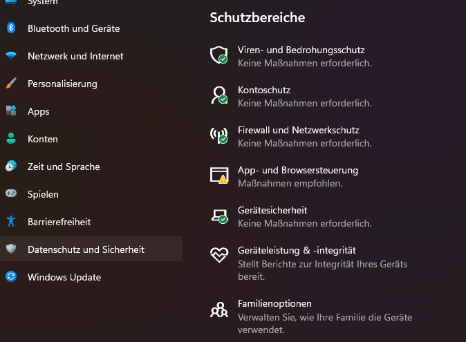 Windows zeigt Euch die einzelnen Schutzbereiche an. Das Warnsymbol aus dem Benachrichtigungsbereich findet Ihr dann an einer oder mehreren Kategorien. Klickt die Kategorie an.