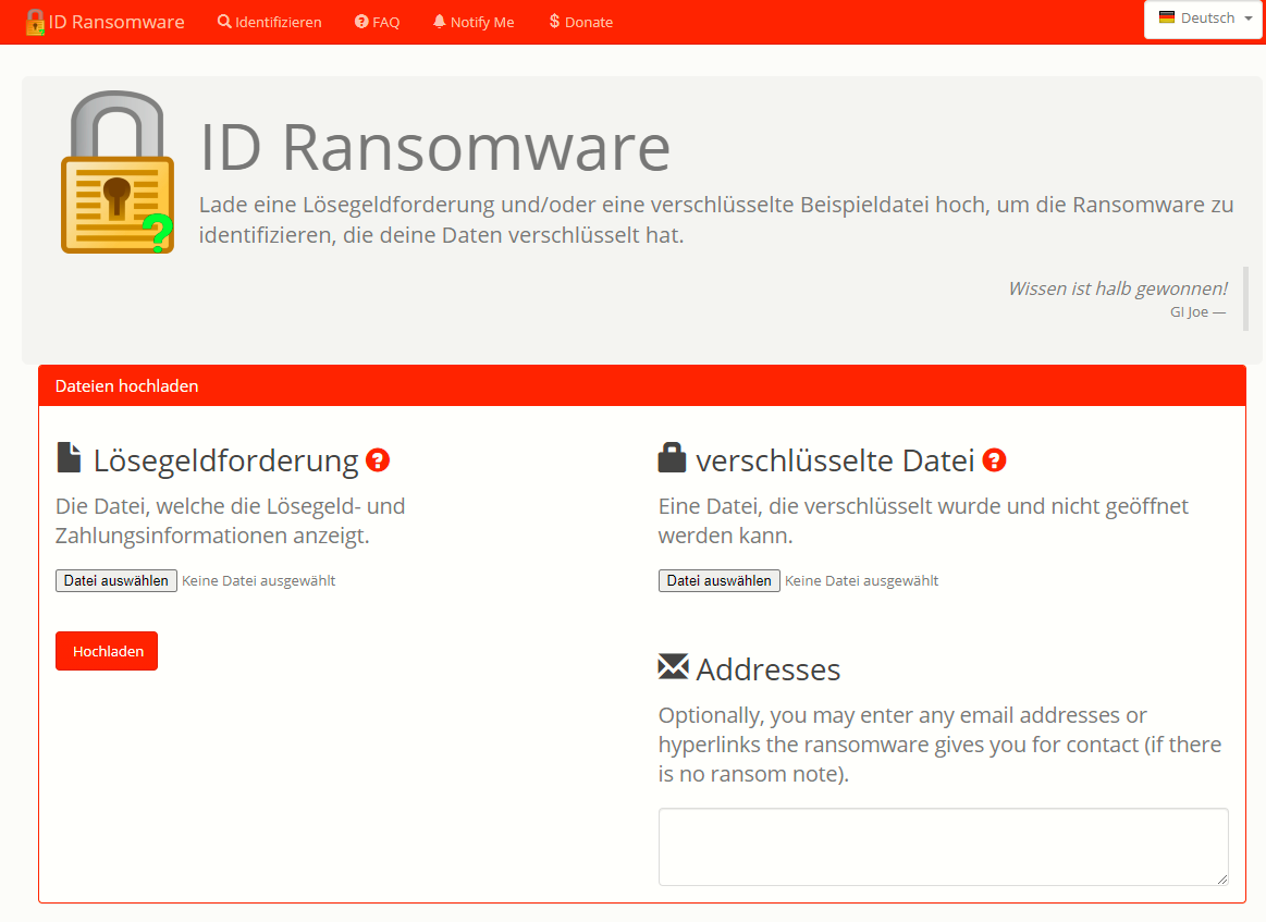 Um weitere Hilfe zu bekommen, können Sie auch einen Screenshot der Lösegeldforderung oder eine bereits verschlüsselte Datei bei dem kostenlosen Dienst ID Ransomware hochladen und bekommen Informationen über die Malware inklusive der ersten Tipps, was Sie als nächstes machen sollten.