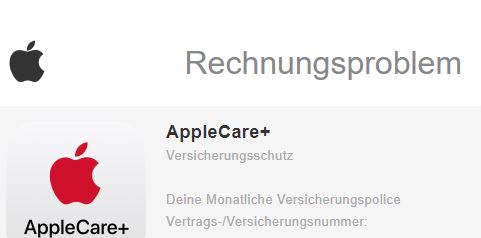 Wenn ihr viele E-Mails bekommt, dann lösen Betreffs wie „Rechnungsproblem“ schnell eine Abwehrhaltung aus. Zu oft wird über solche und ähnliche Betreff-Zeilen ein Versuch gestartet, an Eure Zahlungs- oder Login-Informationen zu kommen. In diesem Fall solltet ihr sie aber trotzdem anschauen und prüfen: Wenn Apple die Zahlung für das AppleCare+ nicht abbuchen kann, dann bekommt ihr eine solche E-Mail.