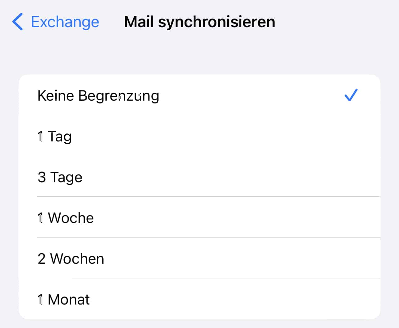 • Tippt dann auf Mail synchronisieren, um den Zeitraum festzulegen.