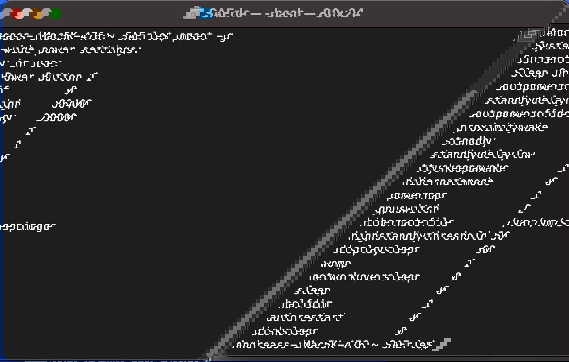 pmset -g assertions listet aktuelle Prozesse auf, die den Schlaf verhindern