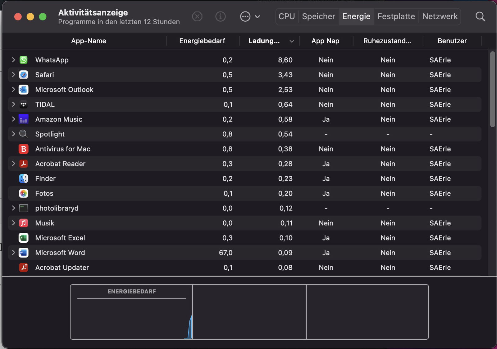 Es kann Apps geben, die einfach laufen wollen und euer Mac daran hindern, in den Standby-Modus zu gehen. Die könnt ihr einfach identifizieren: Startet die Aktivitätsanzeige über Spotlight und klickt auf den Reiter Energie. Ihr findet darin eine Spalte Ruhezustand verhindern. Steht neben einer der Apps in dieser Spalte ein Ja, dann beendet die App.