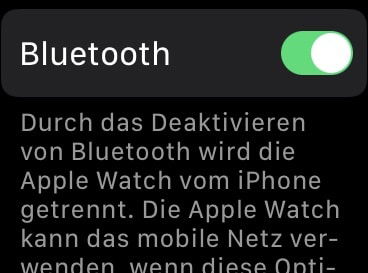 Das klingt auf den ersten Blick zu einfach, ist aber oft die Ursache für Verbindungsprobleme: Gerade unterwegs ist Bluetooth die einzige direkte Verbindung der Watch zum Smartphone. Habt Ihr aus irgendeinem Grund Bluetooth am iPhone ausgeschaltet, dann funktioniert die Verbindung nicht mehr. Am iPhone findet Ihr die Optionen unter Einstellungen > Bluetooth.