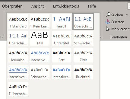 Das könnt ihr schnell korrigieren: Im einfachsten Fall geht ihr in die Zeile mit der falsch nummerierten Überschrift und wählt in der Symbolleiste Start unter Formatvorlagen das richtige Überschriftenformat aus. Wenn das nicht funktioniert, dann werft die Flinte nicht ins Korn. Manchmal bekommt Word das nicht direkt umgesetzt.