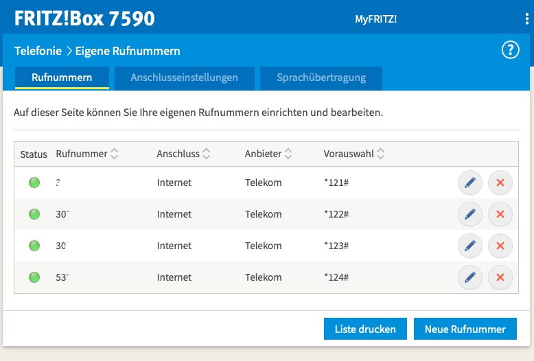 Wenn der Neustart nicht hilft, dann richtet die Rufnummer, die die Probleme bereitet, neu ein. Dazu klickt ihr in der Benutzeroberfläche der Fritz!Box auf Telefonie > Eigene Rufnummern. Rechts von jeder Rufnummer findet ihr ein rotes Kreuz. Klickt darauf, um die Rufnummer zu löschen. Klickt dann auf Neue Rufnummer, um die gerade gelöschte Rufnummer wieder neu anzulegen. Dabei findet eine erneute Registrierung der Rufnummer im Netz statt. Das sorgt dafür, dass die Übergabe zwischen Fritz!Box und Telefonnetz wieder einwandfrei funktioniert.