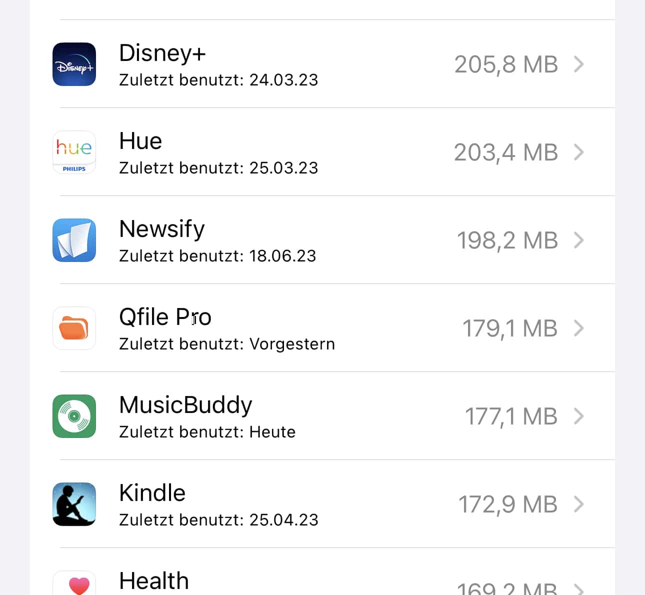- Öffnet durch ein Tippen auf iPhone-Speicher die Übersicht des belegten Speichers.