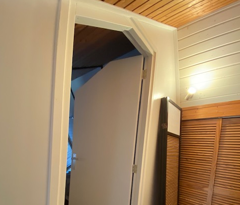 Hier sorgt das Fotografieren von unten nach oben dafür, dass der Vordergrund nach rechts verschoben wird und der gerade Teil des Türrahmensschräg erscheint. Im Original sieht dieser nämlich so aus: