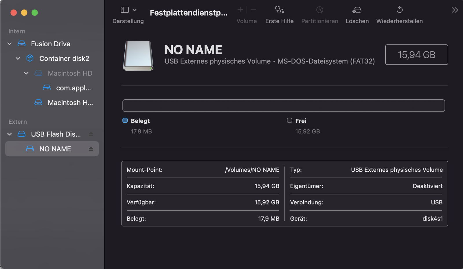 Der erste Schritt sollte immer die Kontrolle der Karte sein. Oft hat diese sich durch den Transport gelockert und steckt nicht mehr ganz im Slot. Hilft das nicht weiter, dann ist das Festplattendienstprogramm von macOS die beste Anlaufstelle. macOS zeigt die SD-Karten und USB-Sticks in einem eigenen Bereich Extern an. Klickt den jeweils unteren Eintrag eines Datenträgers an, dann zeigt die App alle Eigenschaften (wie beispielsweise die Formatierung und Kapazität) im Detailbereich an.