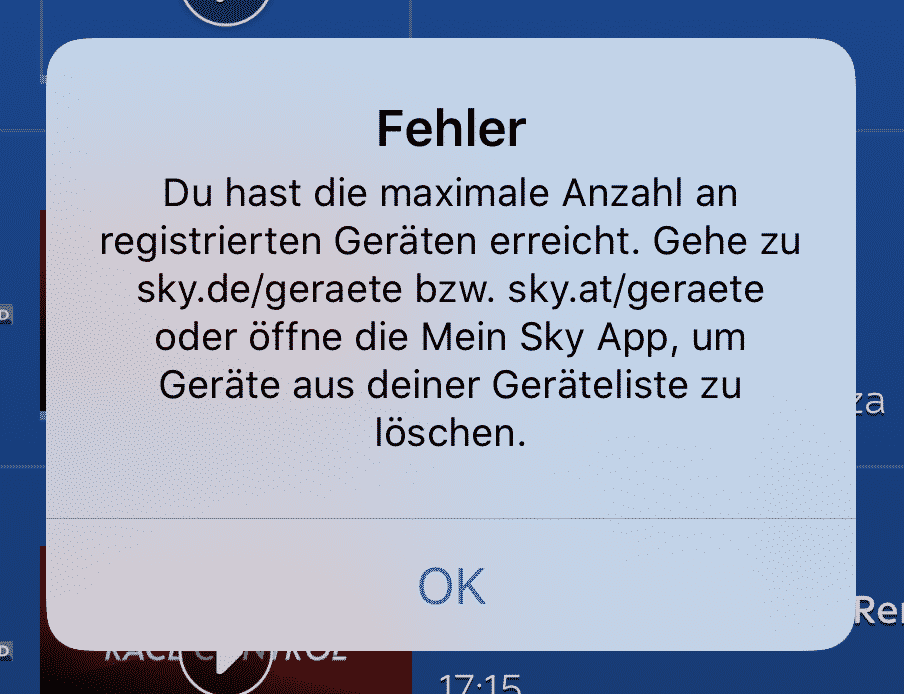 Ihr habt standardmäßig nur eine Sky Go-Lizenz zur Verfügung. Es können also nicht zwei mobile Geräte gleichzeitig streamen. Sehr wohl könnt ihr aber auf eurem Receiver und auf einem mobilen Gerät parallel eine Sendung anschauen. Hinzu kommt die Obergrenze von fünf registrierten Geräten. Ist diese erreicht, erhaltet ihr eine Fehlermeldung. Um diese zu umgehen und eure Wunschsendung zu schauen, löscht ein Gerät aus der Geräteliste. Das funktioniert allerdings nur fünfmal pro Monat!