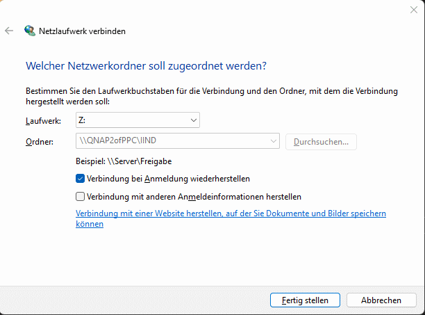 - Der Ordner ist die Netzwerkadresse, die Windows automatisch erkennt. Sie hat die Form \<Server><Freigabe>. Hier müsst Ihr normalerweise nichts ändern.