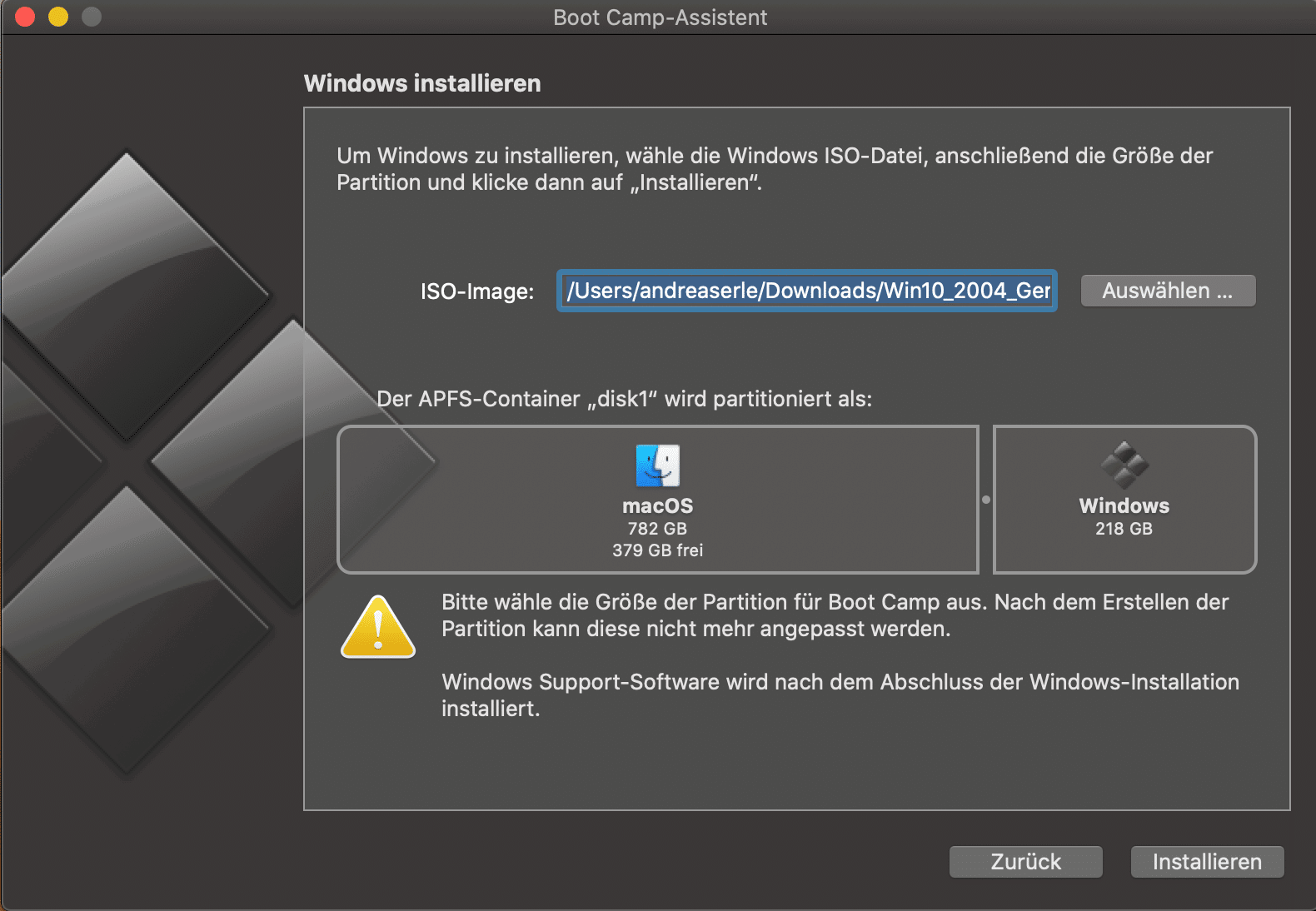 Für alle anderen mit Intel-Macs ist Bootcamp nach wie vor die beste Lösung für Windows auf dem Mac. Die Installation ist Apple-typisch einfach: Tippt in Spotlight bootcamp ein, dann startet ihr den macOS-internen Bootcamp-Assistenten. Dazu müsst ihr alle extern angeschlossenen Laufwerke abnehmen.