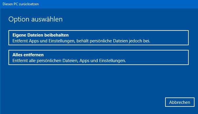 Jetzt kommt die wichtige Entscheidung: Eigene Dateien beibehalten oder Alles entfernen. Bei der zweiten Option werdet ihr nochmals gewarnt – und das zu Recht. Checkt also vorher, ob alle wichtigen Daten gesichert sind.