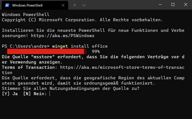 Bei erfolgreicher Suche zeigt WinGet Details zum Programm an und startet nach eurer Bestätigung die Installation. Sogar Lizenzvereinbarungen werden automatisch abgeholt und können per Parameter akzeptiert werden. Das Programm wird dann genauso installiert, als hättet ihr es manuell heruntergeladen.