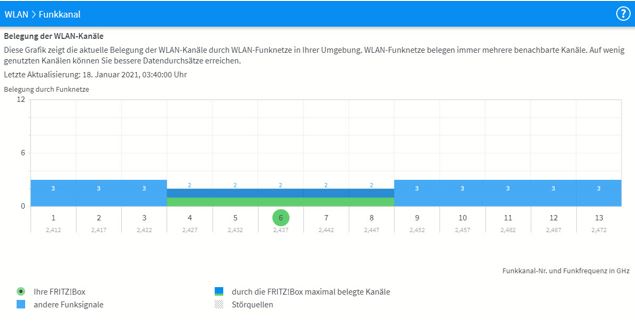 - Unter WLAN > Funkkanal bekommt ihr eine Übersicht, welchen Kanal der Router gerade aktuell verwendet und wie viele Netzwerke jeweils die verfügbaren Kanäle verwenden.